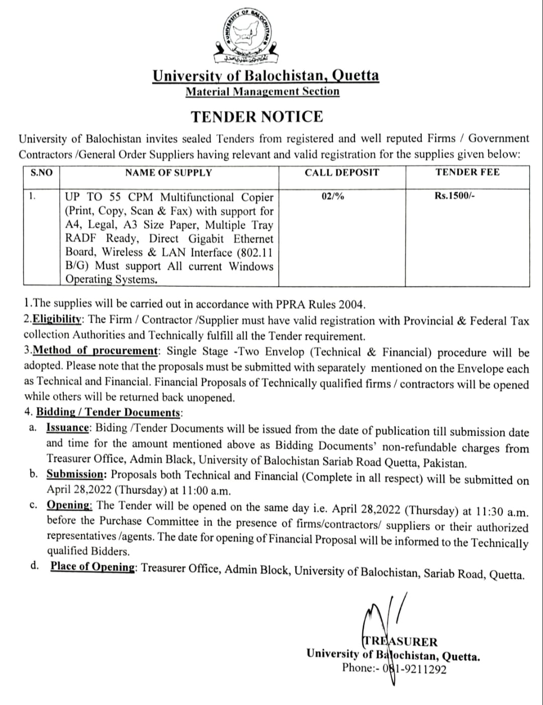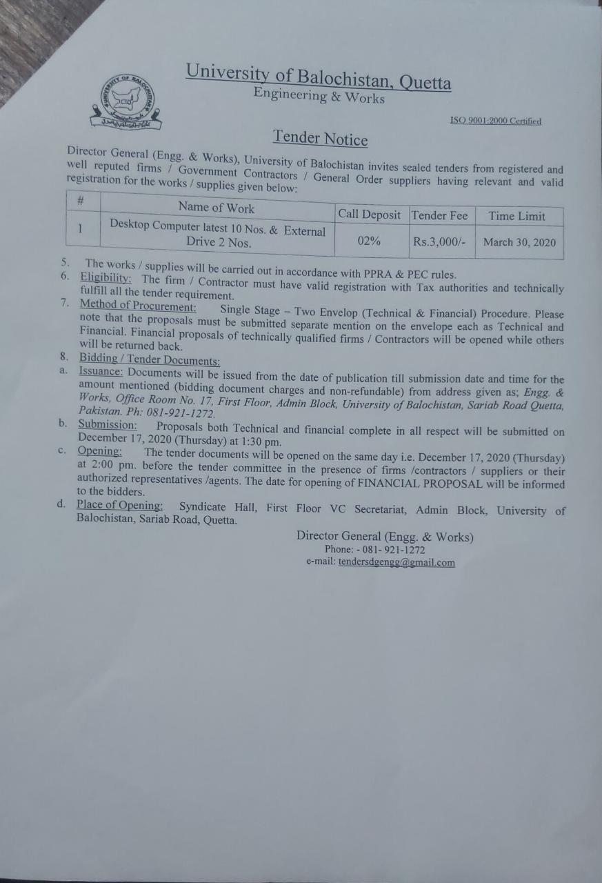 Tender Notice Supply of Teaching aid Equipments (for sub campuses Kharan & Mastung) , Hybrid PABX Exchange & ICT equipments (for JB Campus) University of Balochistan