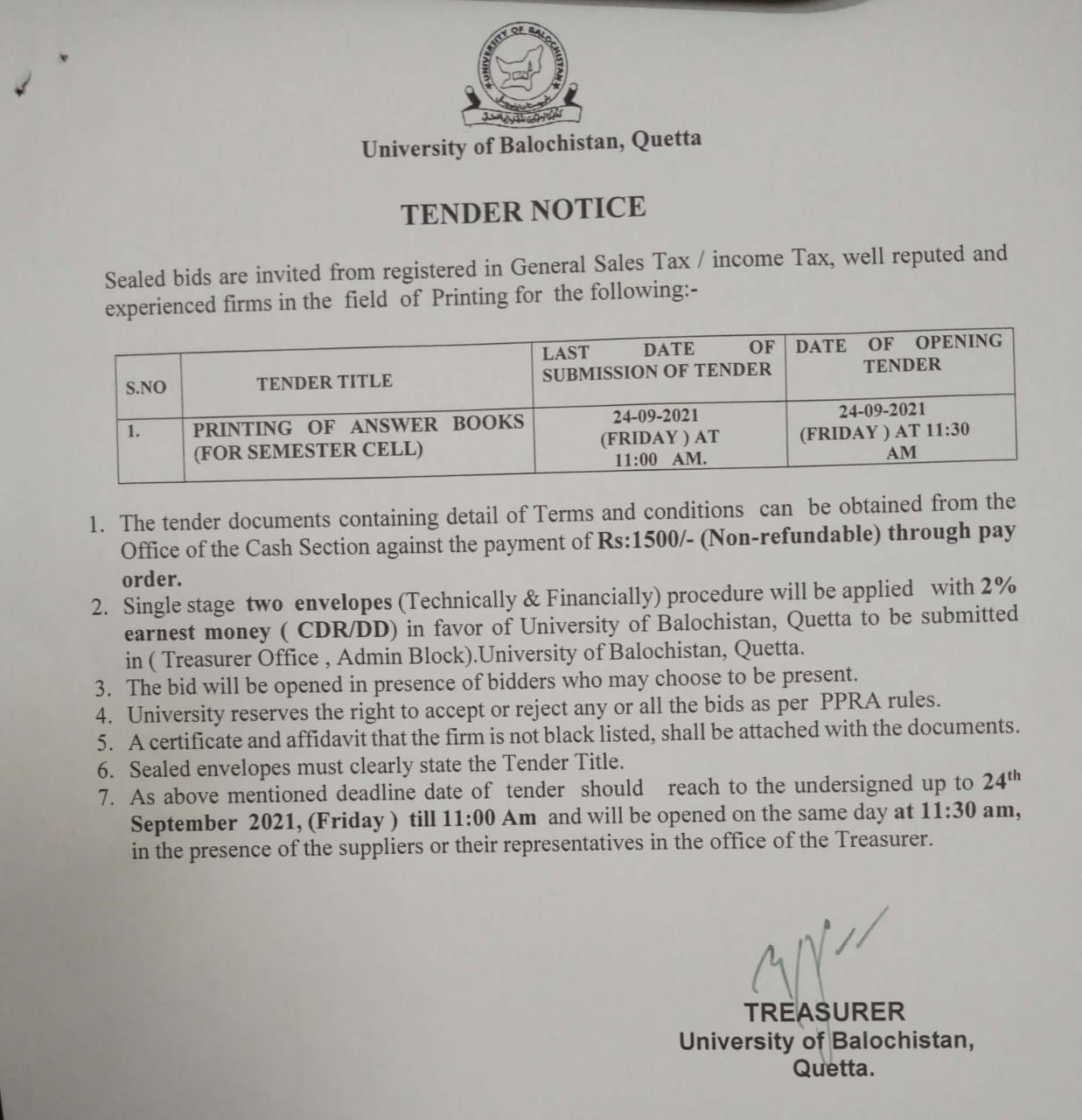 Tender Notice: PRINTING OF PROSPECTUS ALONG WITH ADMISSION FORMS FOR BS PROGRAMME.