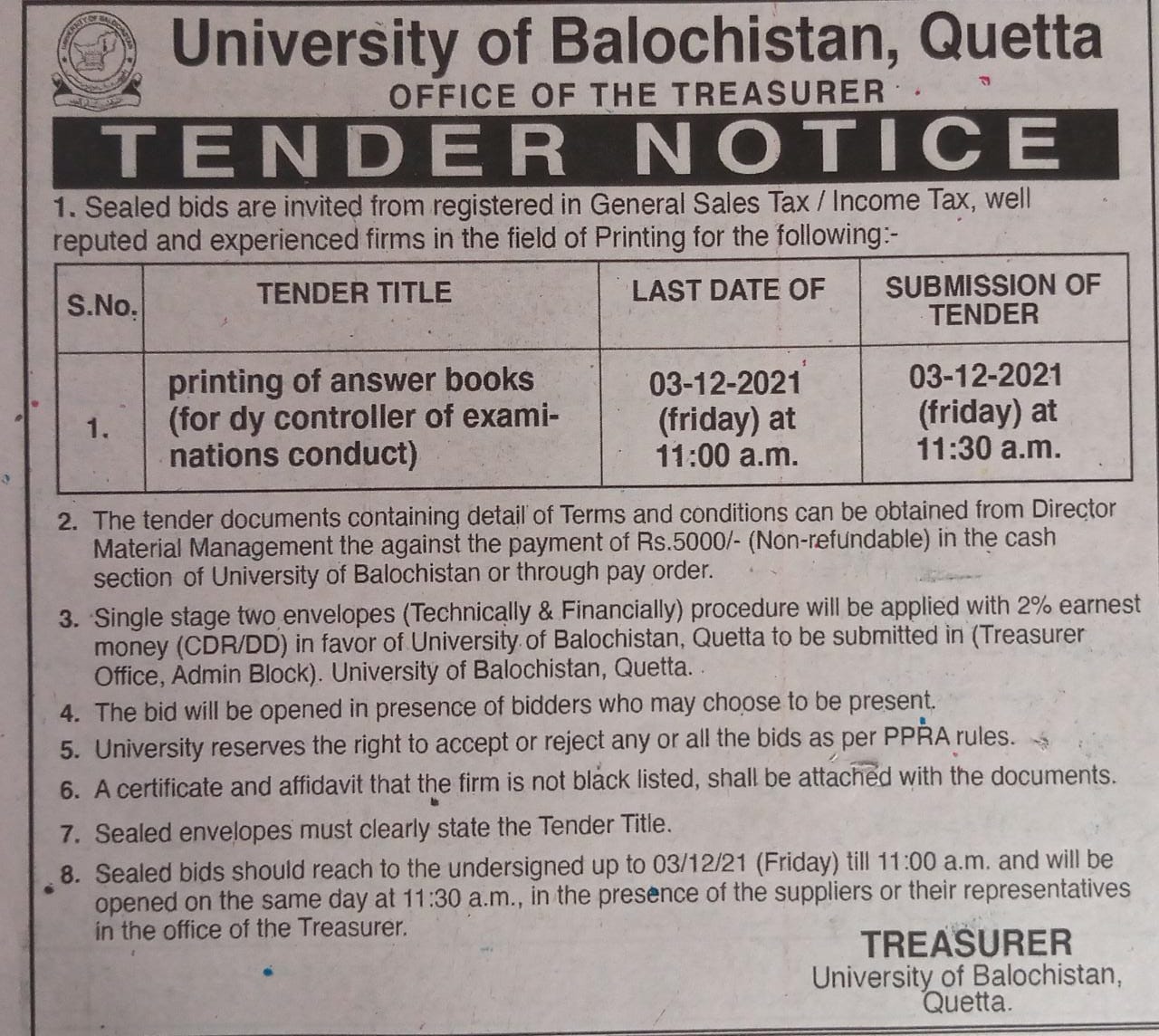 Corrigendum (Tender Notice): University of Balochistan, Quetta invite sealed bids from reputable chartered Accountant firm to hire against the following services