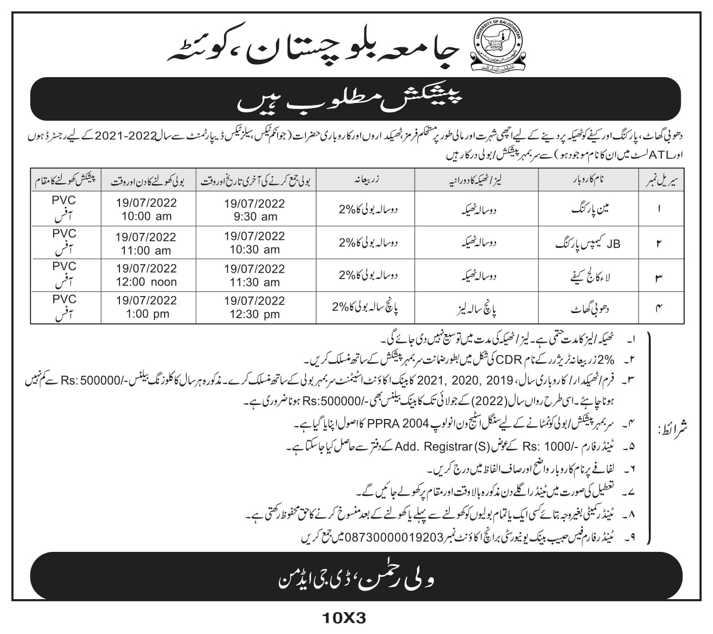 Tender Notice: University of Balochistan, Quetta invite sealed bids from reputable chartered Accountant firm to hire against the following services,