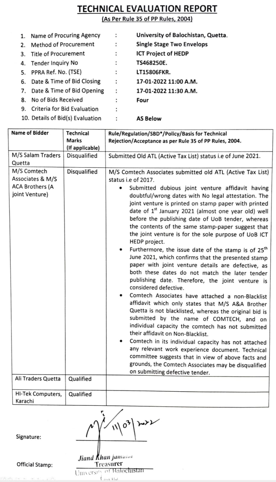 Tender Notice: Supply of Technical Aid Equipment of the project "Strengthening of the University of Balochistan, Quetta & its Campuses"
