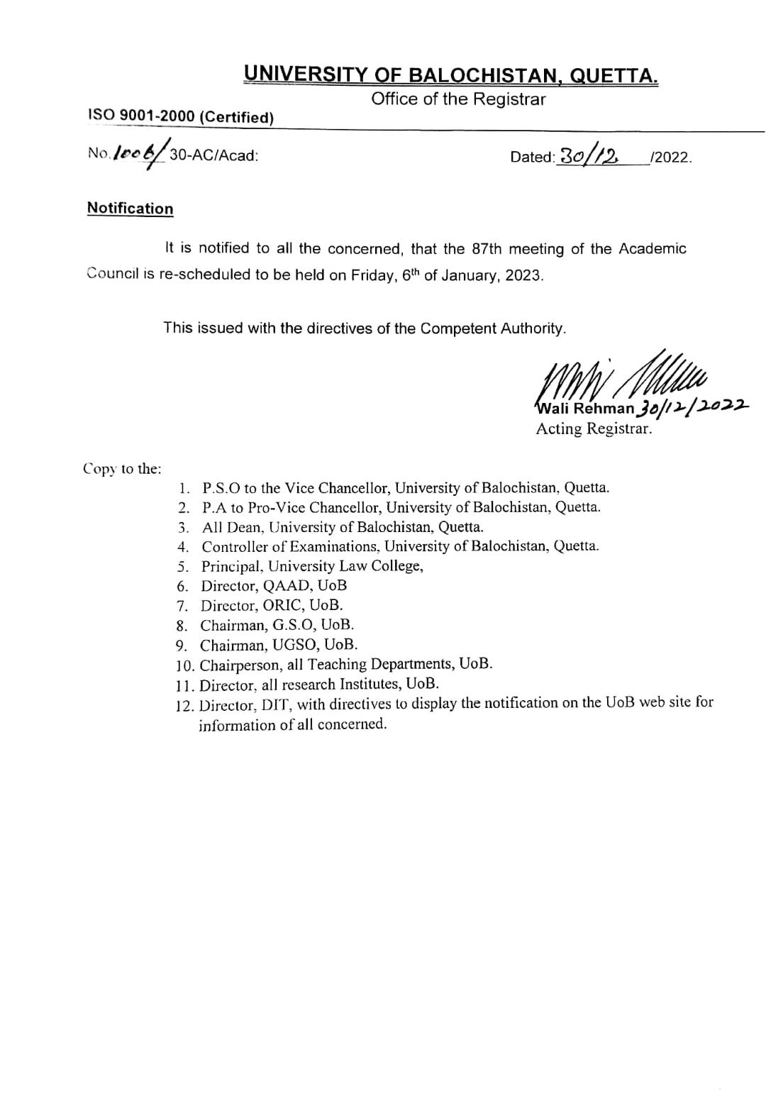 University of Balochistan Quetta & its Sub-Campuses will remain closed on account of