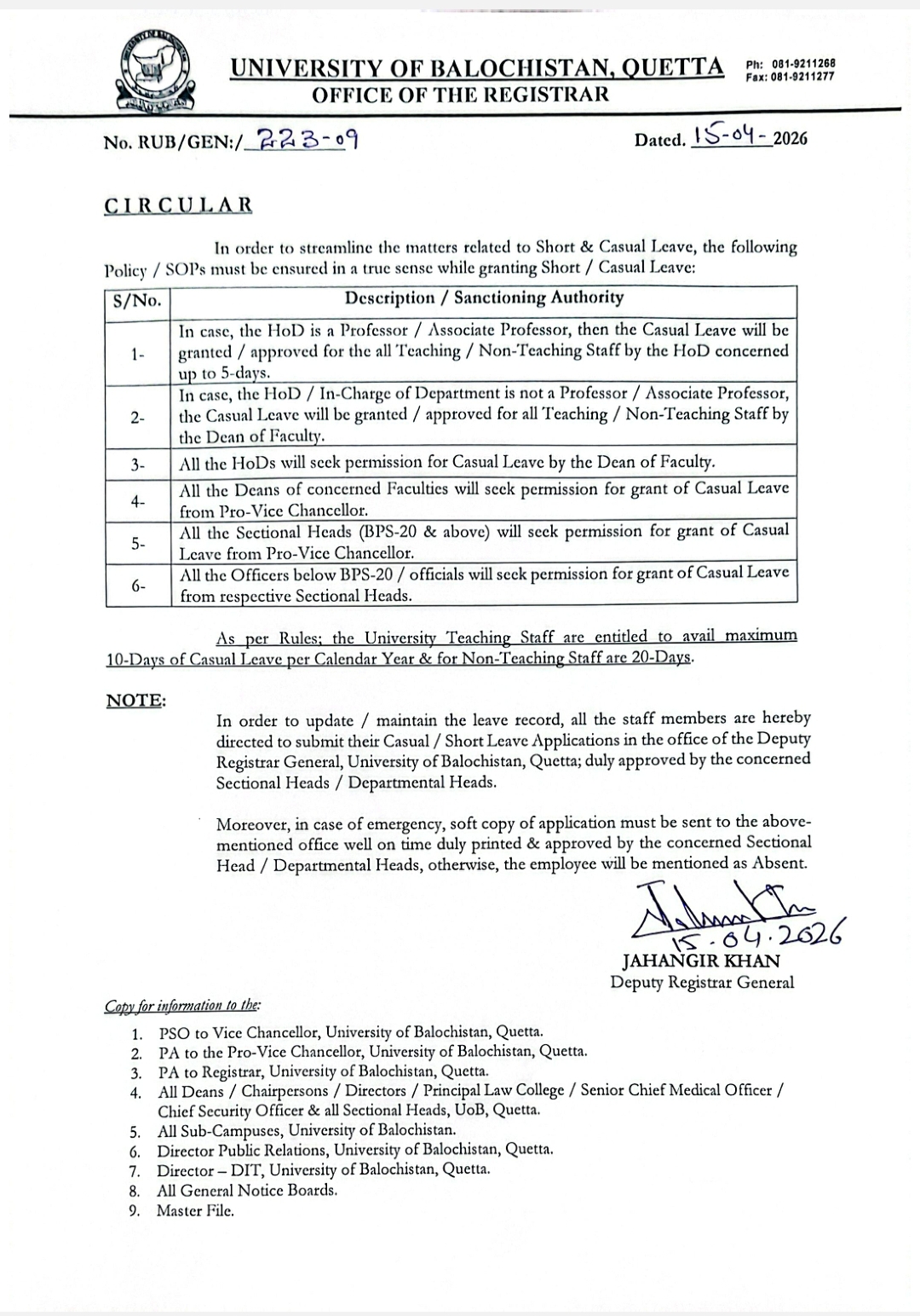 Regarding Casual Leave Regulations for Teaching and Non-Teaching Staff |