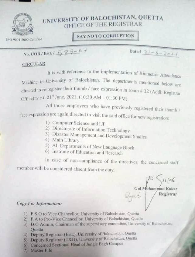 staff members (Teaching / Non Teaching) of UoB are directed to submit a copy of