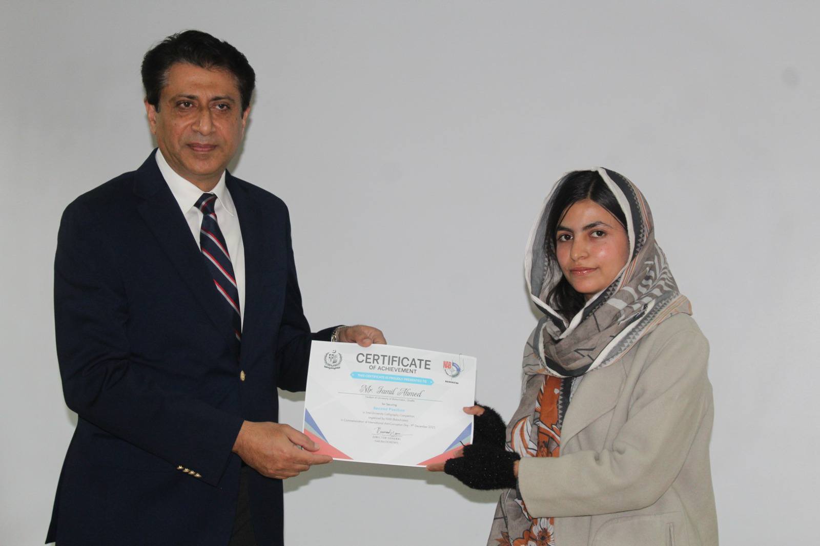 The pride of the University of Balochistan, former graduate student of the Department of DPT, Maryam Sabir Hussain, was felicitated by the Vice Chancellor, Professor Dr. Zahoor Ahmed Bazai, for her academic success in joining the CSS Information Group.