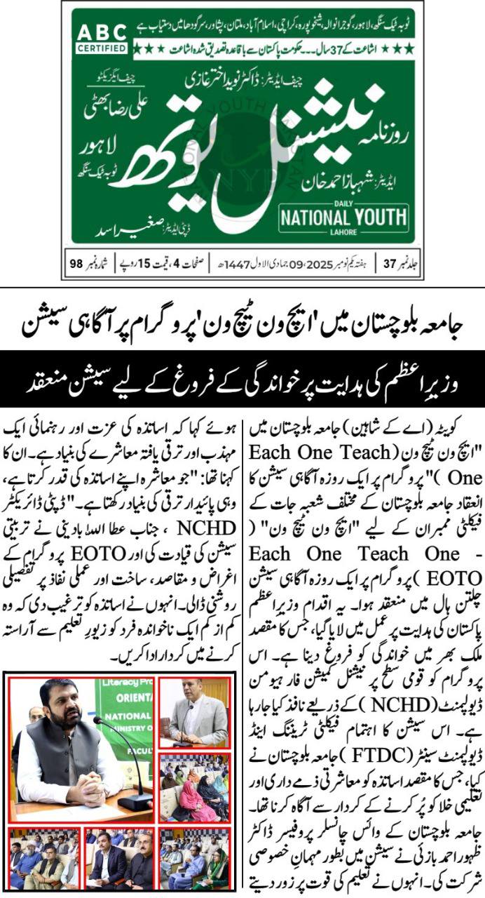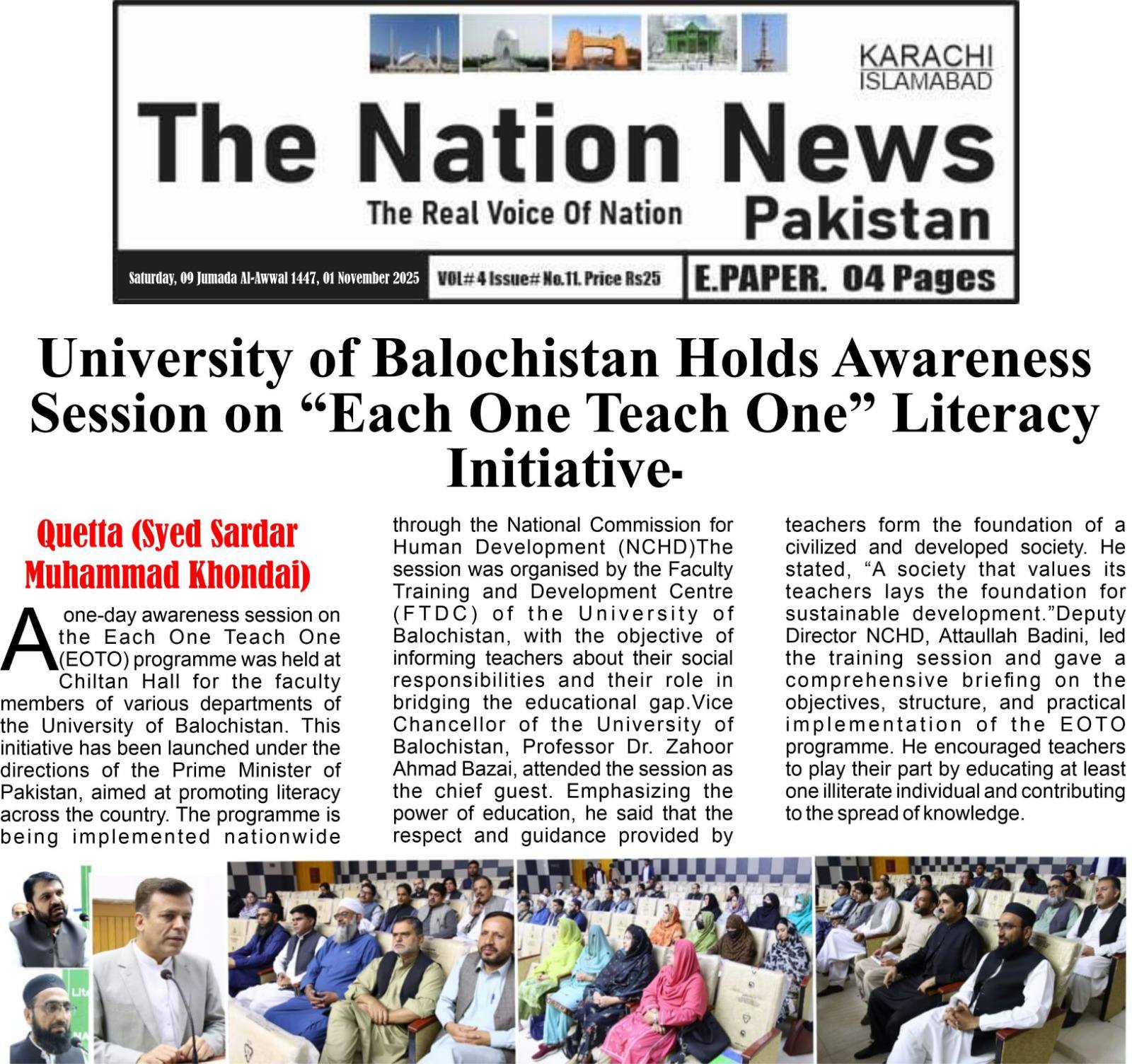 One-day awareness session on “Each One Teach One” program held at University of Balochistan